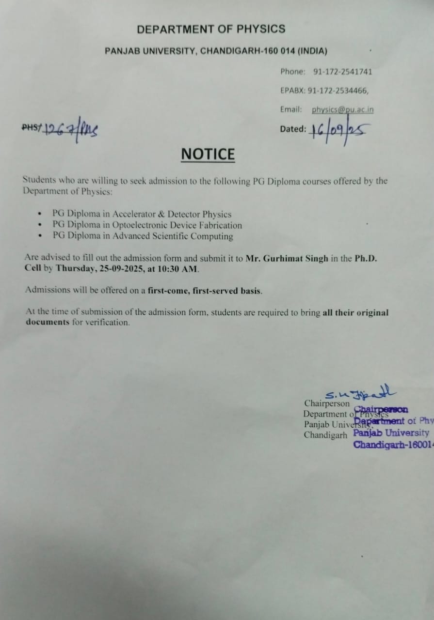 Notice Regarding Admisson for Various PG Diploma Courses running in Physics Dept. |