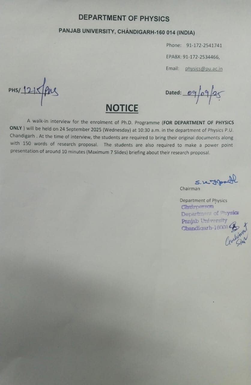 WALK-IN-INTERVIEW for Enrollment in PhD in Dept. of Physics |