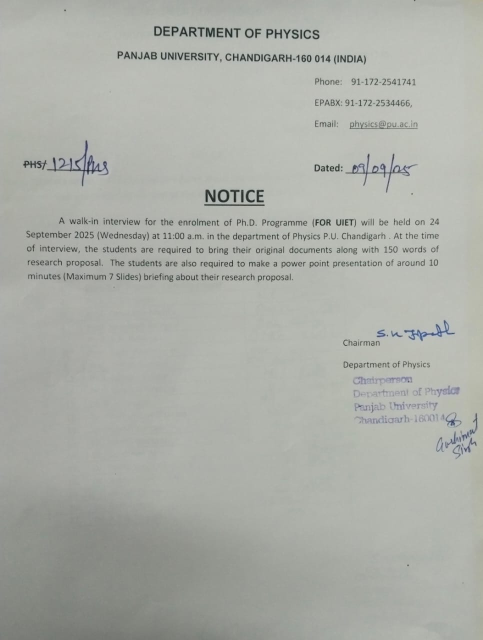 WALK-IN-INTERVIEW for Enrollment in PhD in UIET |